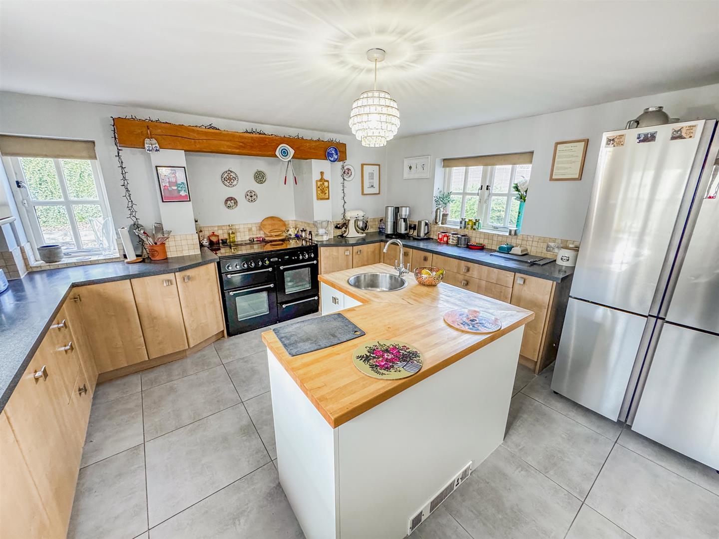 Fitted to comprise a range of base and eye level units with a one and half bowl steel sink and drainer, single bowl sink located on an island with under counter storage, integrated dishwasher, space for free standing range cooker, space for American fridge/freezer, double glazed window to front and rear elevation, double glazed French doors to garden.