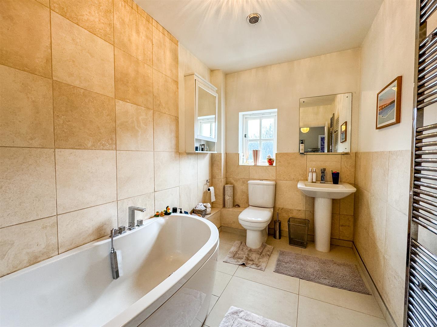 Fitted to comprise a three piece suite consisting of a panel bath, low level wash hand basin, low level pedestal, radiator, double glazed window to rear elevation.