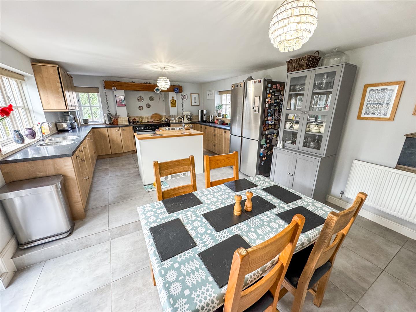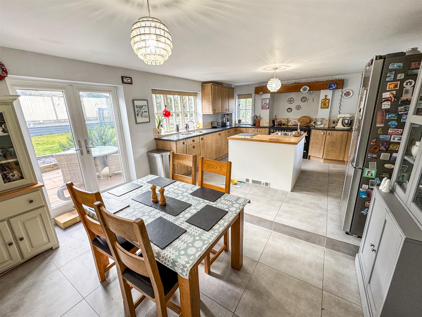 The heart of the home is a beautifully appointed kitchen/dining room, featuring extensive cabinetry, quality work surfaces, and a central island—perfect for both everyday living and entertaining. French doors provide a seamless connection to the garden. A separate utility room and guest cloakroom complete the ground floor.