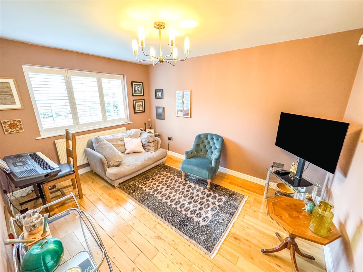 A welcoming reception hall introduces a home of superb proportions. The principal living room is both elegant and inviting, with French doors opening onto the landscaped garden. A separate lounge provides a more intimate setting, while a dedicated study offers an ideal work-from-home space.