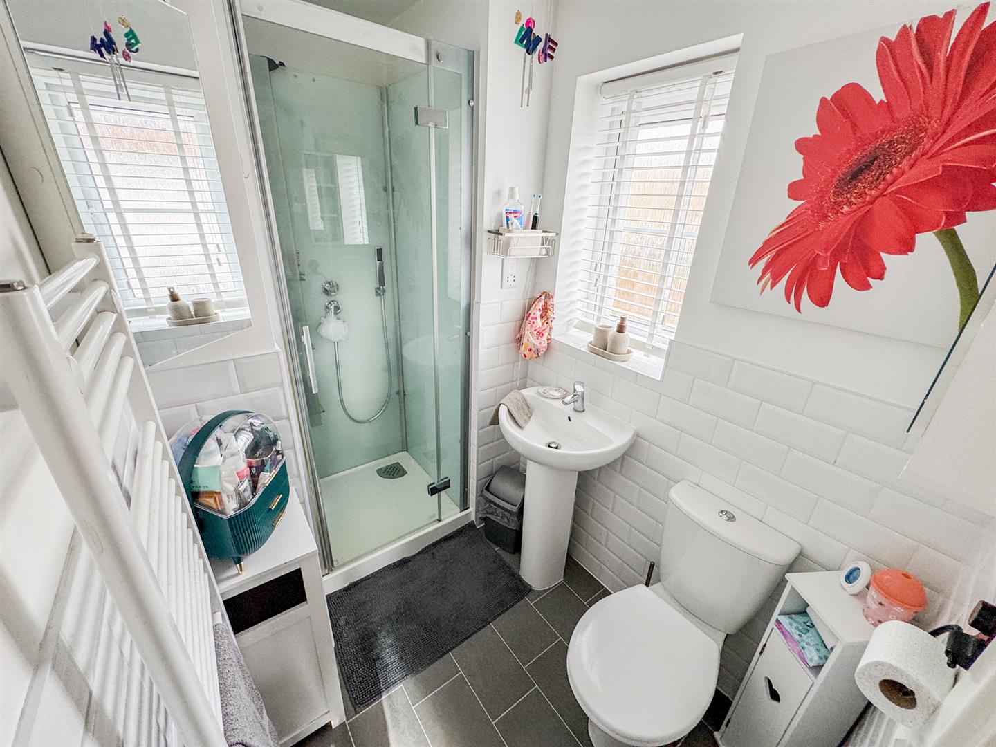 Fitted to comprise a three piece white suite consisting of a walk in mains feed double shower, low level wash hand basin, low level pedestal, radiator, extractor fan and double glazed window to front elevation.