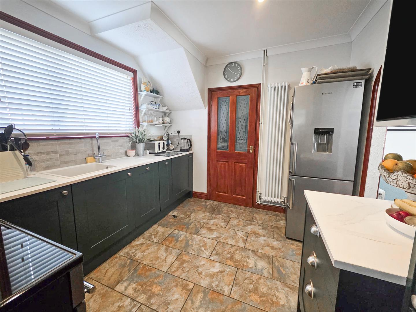 Fitted to comprise a range of modern base and eye level units with a single sink and drainer, space for free standing gas/electric cooker, space for fridge/freezer, intergrated washing machine, double glazed window to front elevation, radiator