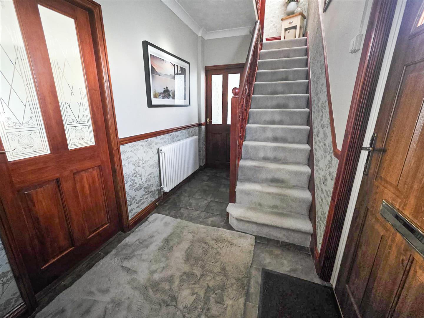 Entered via a double glazed door, radiator, stairs rising to first floor landing, doors to: