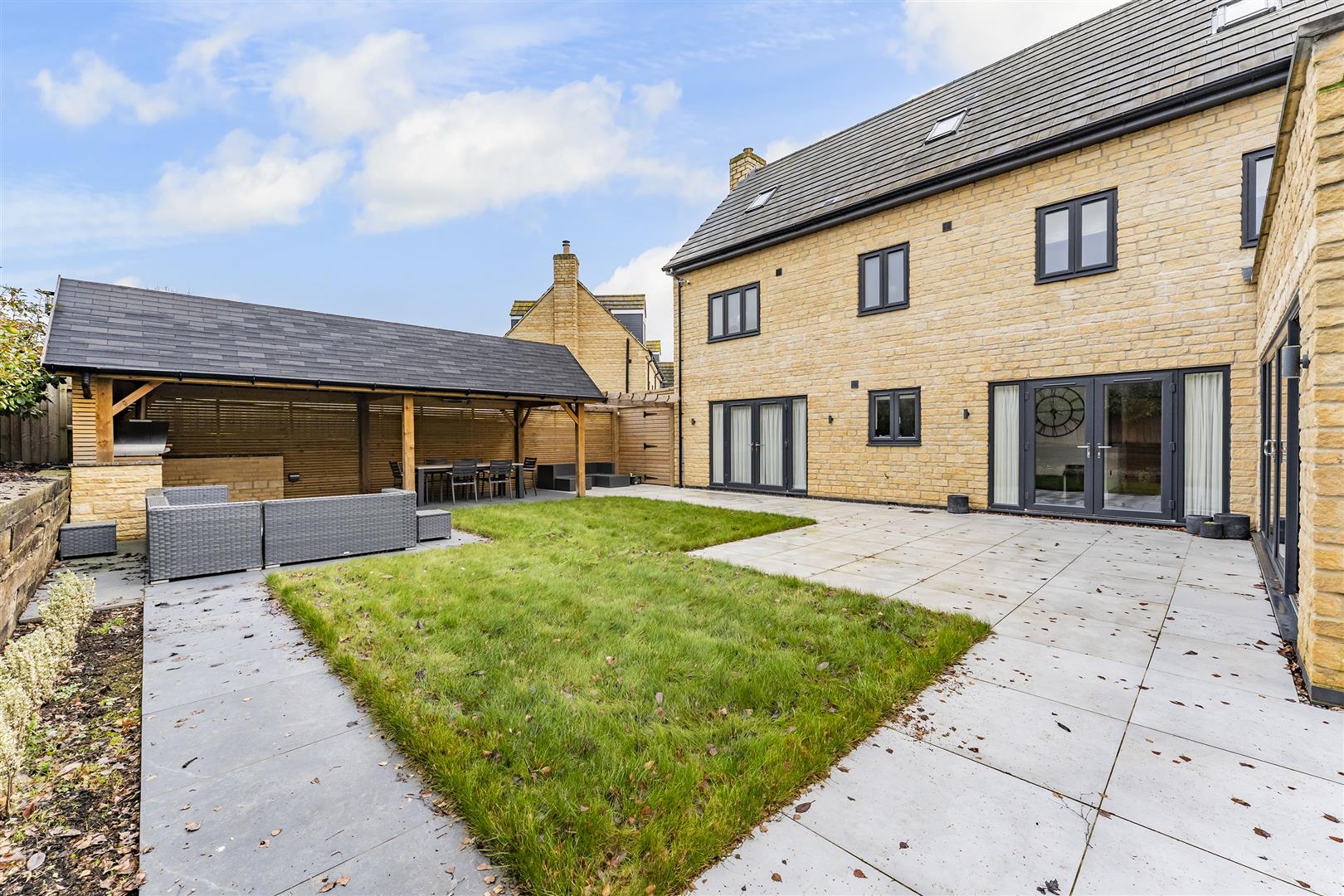 Rear: A laid lawn leads onto a large patio area which features a large pergola with an outside kitchen and sitting area, a large timber built shed provides further storage area. gated access is provided to the front while the garden is enclosed by timber fencing to all sides.