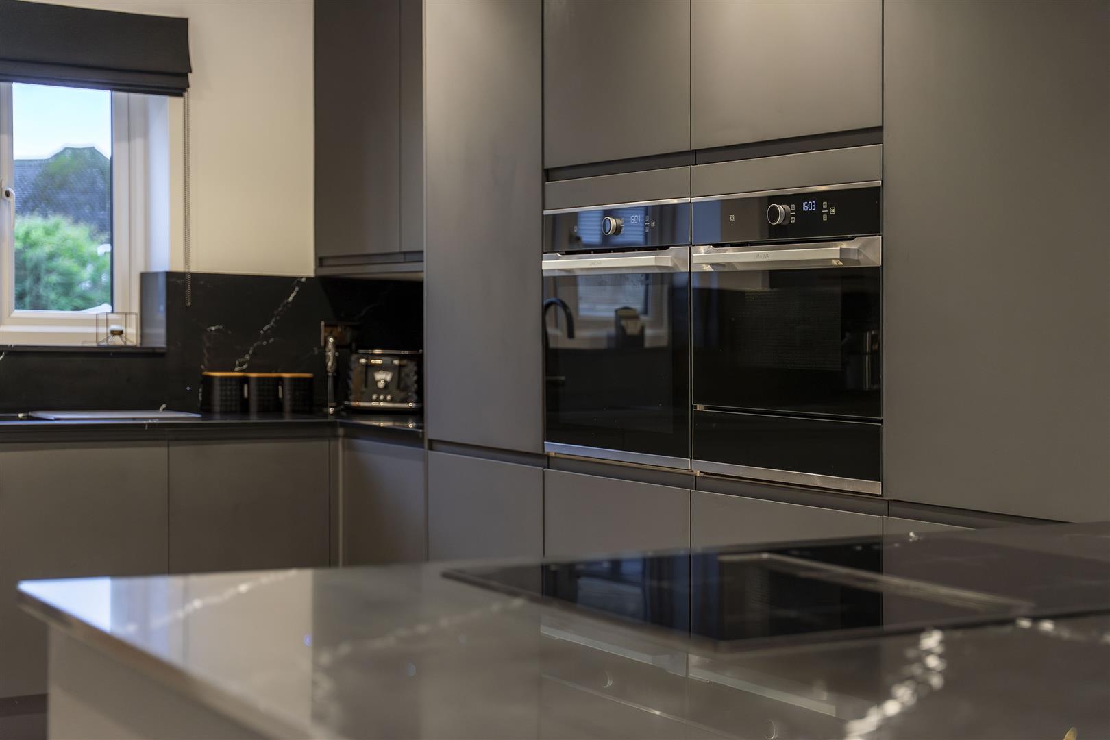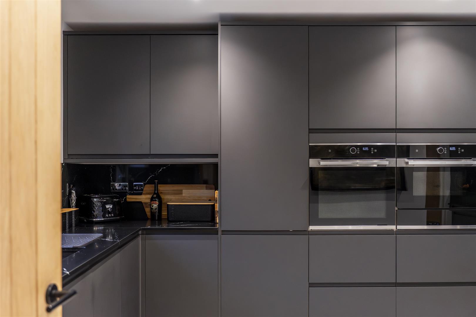 Fitted to comprise a range of and eye level units with space for an automatic washing machine, space for tumble dryer, extractor fan, double glazed window to rear elevation, ceiling spotlights.