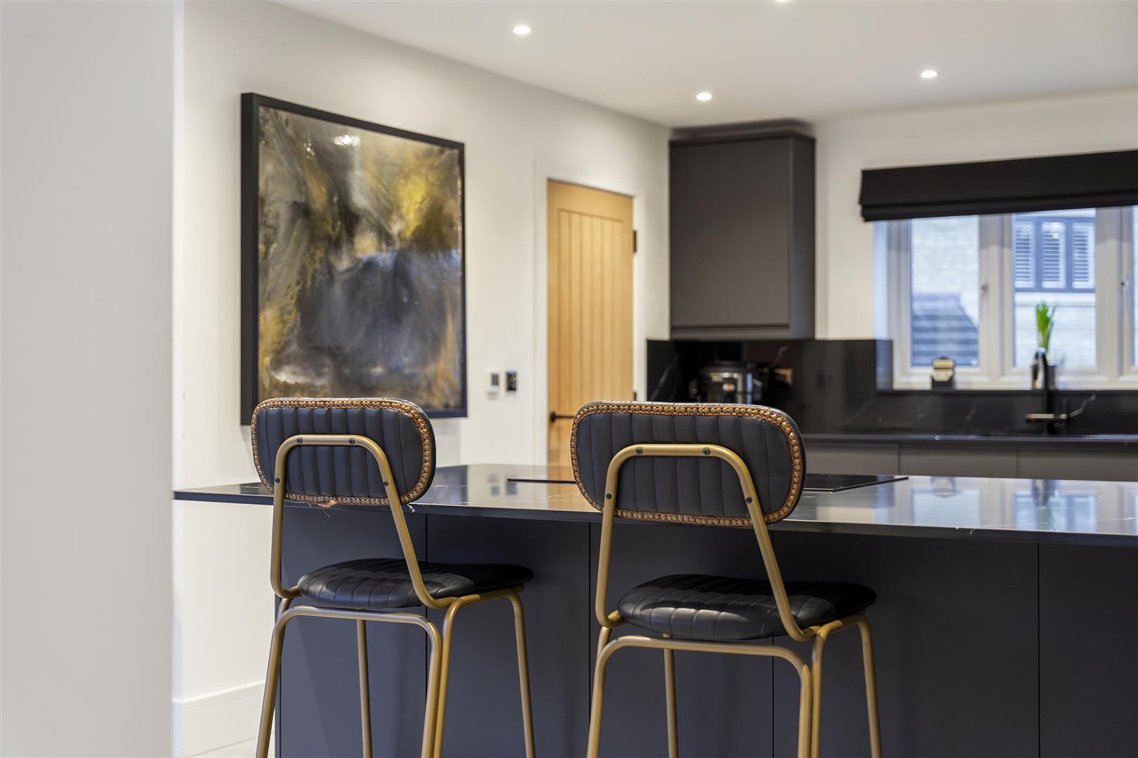 Fitted to comprise a range of base and eye level units with a single sink and drainer, induction hob with extractor, double electric oven, integrated dishwasher, integrated full height fridge and full height freezer, breakfast bar, ceiling spotlights, underfloor heating, double glazed window to front elevation, double glazed French doors to rear elevation, doors to:
