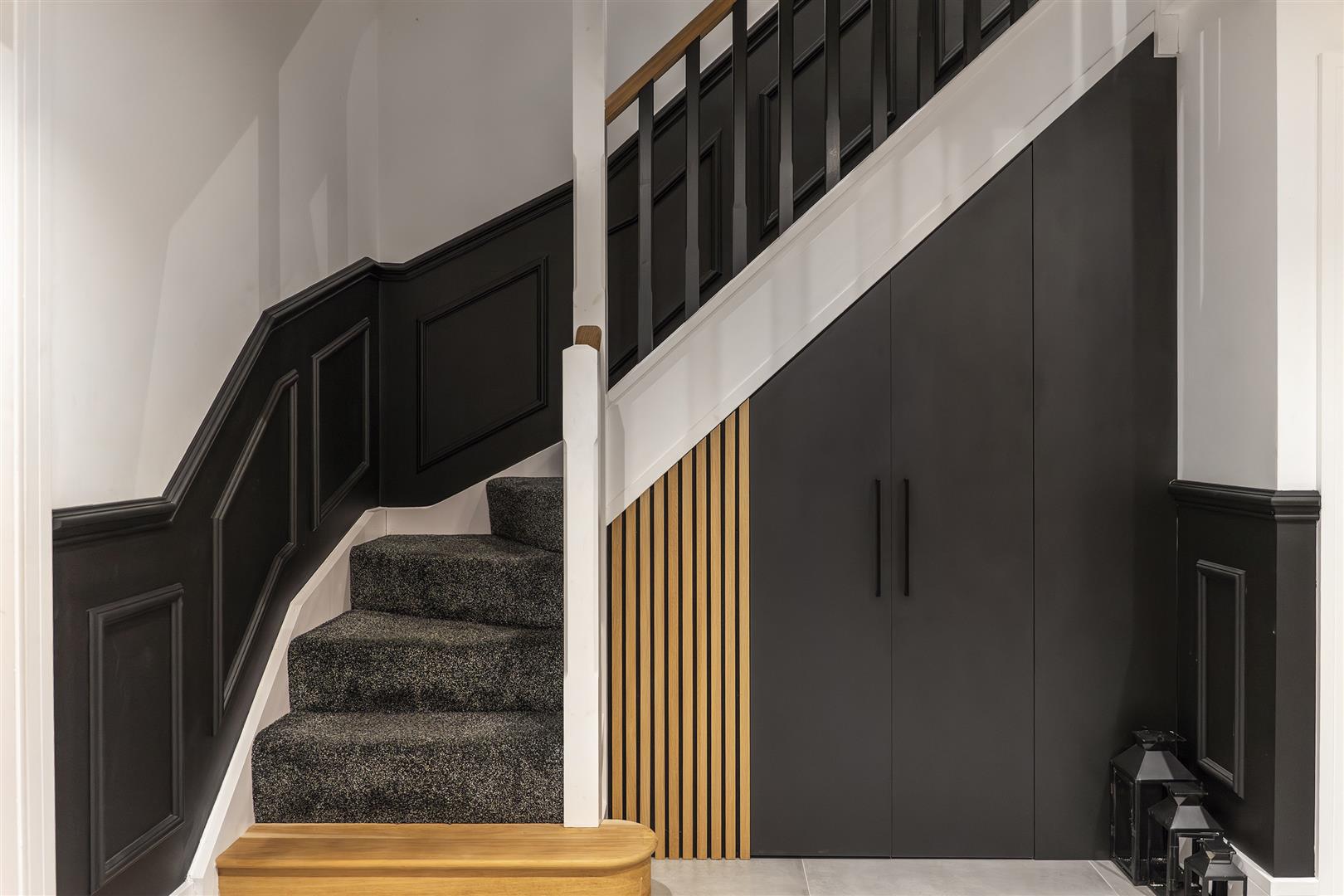 Entered via a double glazed door, underfloor heating, understairs storage, storage cupboard, ceiling spotlights, double glazed window to front elevation, doors to:
