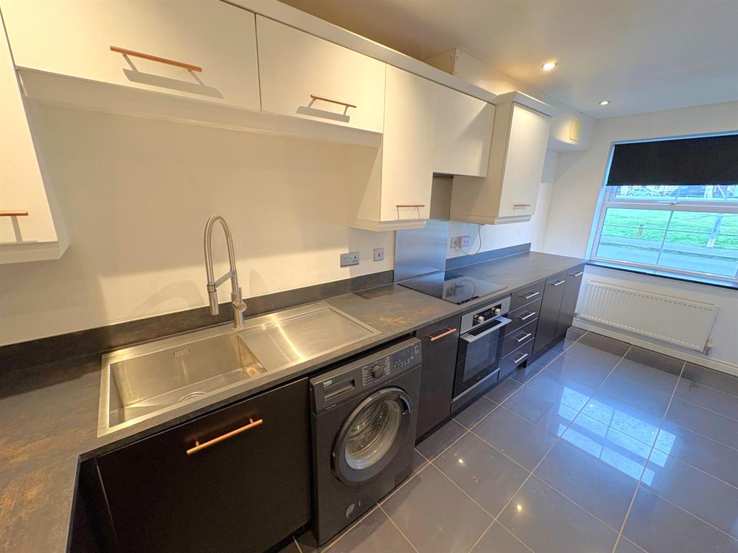 Fitted to comprise a range of base and eye level units with a one and a half sink and drainer, gas hob with extractor, electric oven, space for free standing fridge/freezer, space for automatic washing machine, radiator, double glazed window to front elevation.