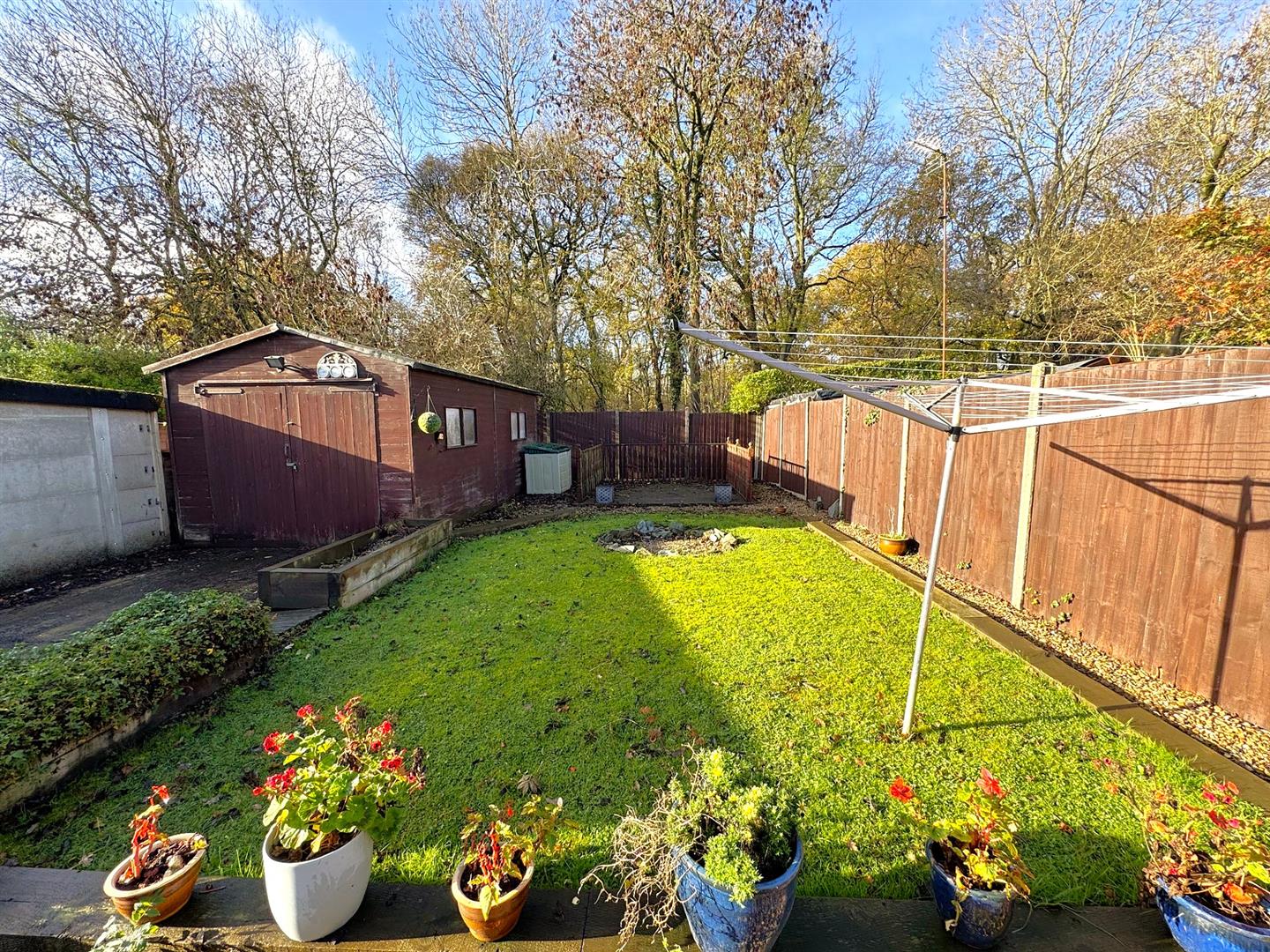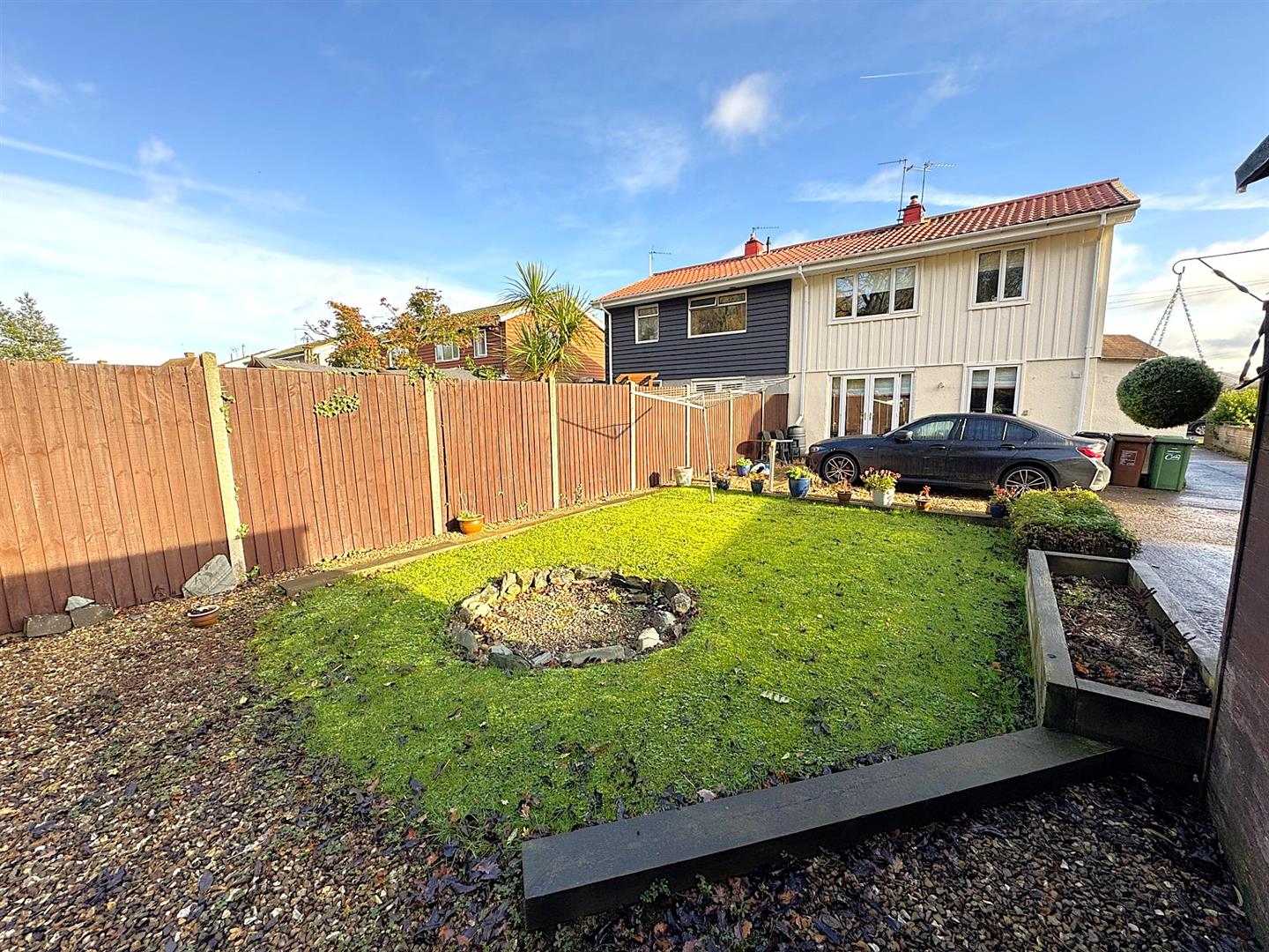 Rear: A low maintenance gravel area leads onto a laid lawn and further raised decking area while being enclosed by timber fencing to all sides.
