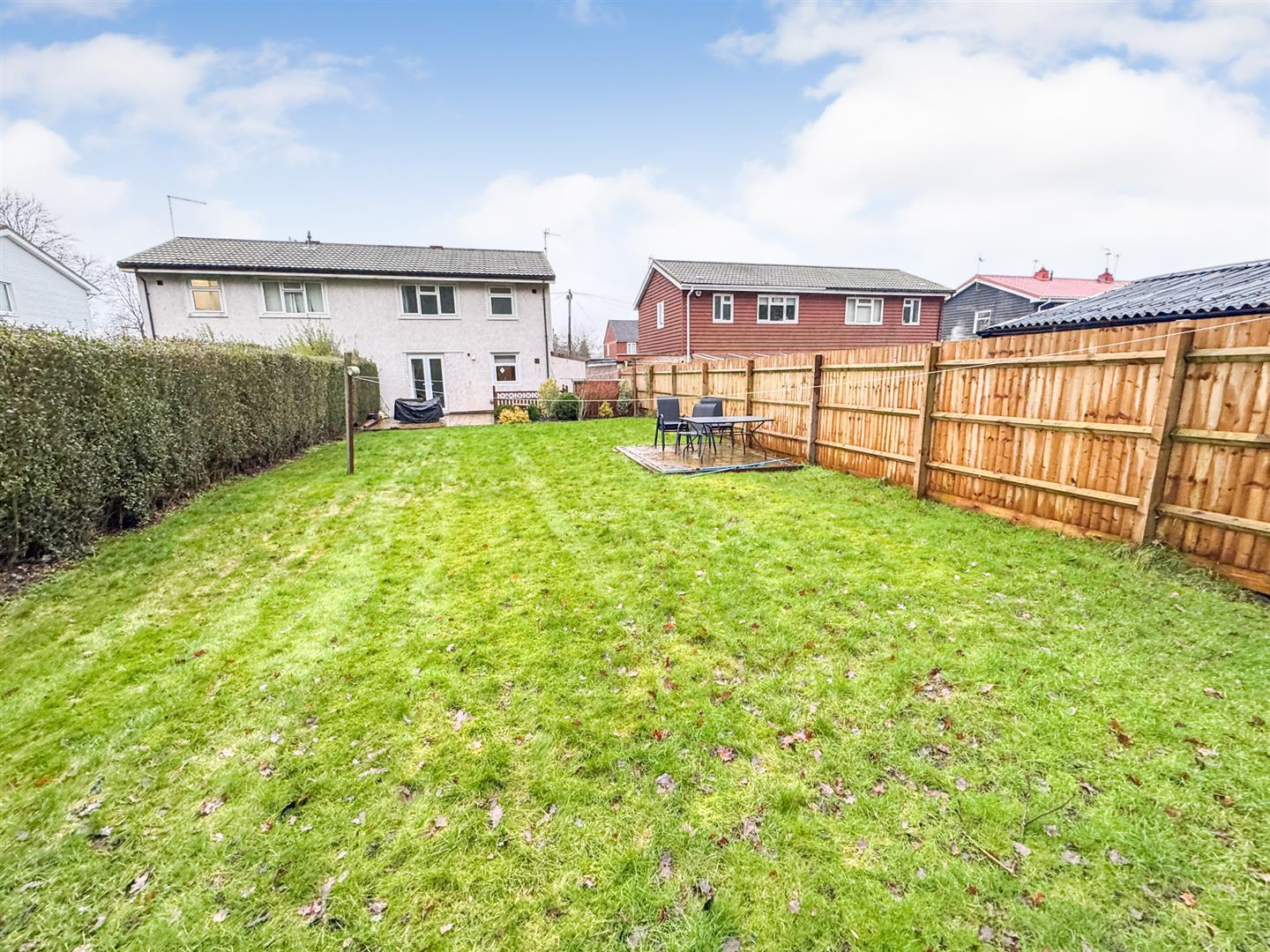 Rear: A patio area leads onto a larger than average laid lawn with a separate patio area to one side and a raised planting bed to the rear, the entire garden s enclosed by timber fencing and privet hedges.