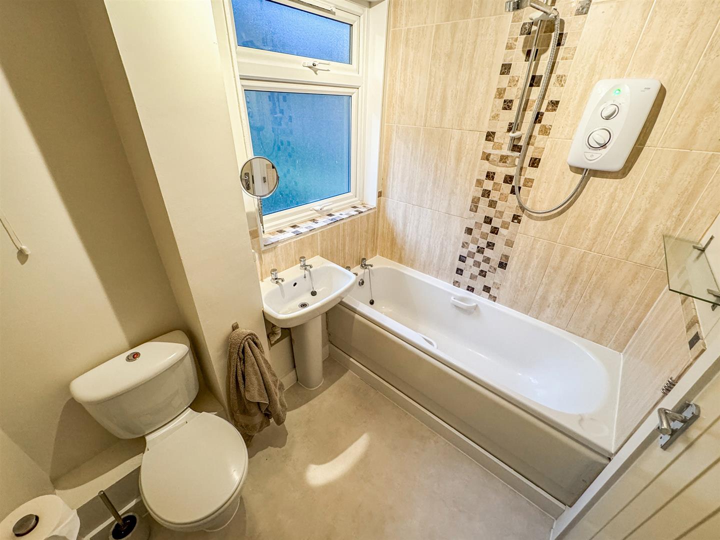Fitted to comprise a three piece suite consisting of a panel bath with electric shower over, low level wash hand basin, low level pedestal, radiator, double glazed window to rear elevation.