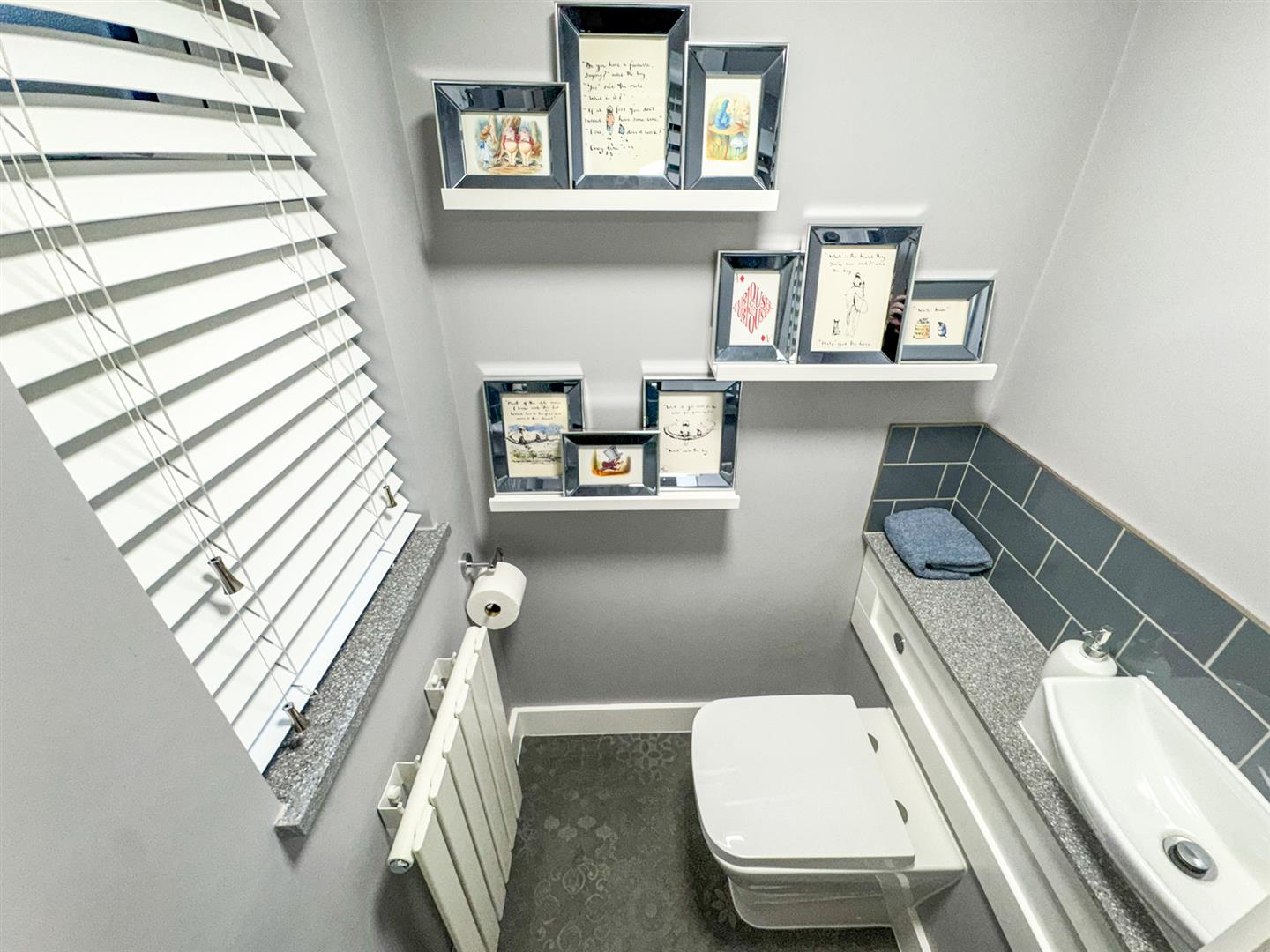 Fitted to comprise a two piece suite consisting of a low level wash hand basin, low level pedestal, radiator, double glazed window to side elevation.