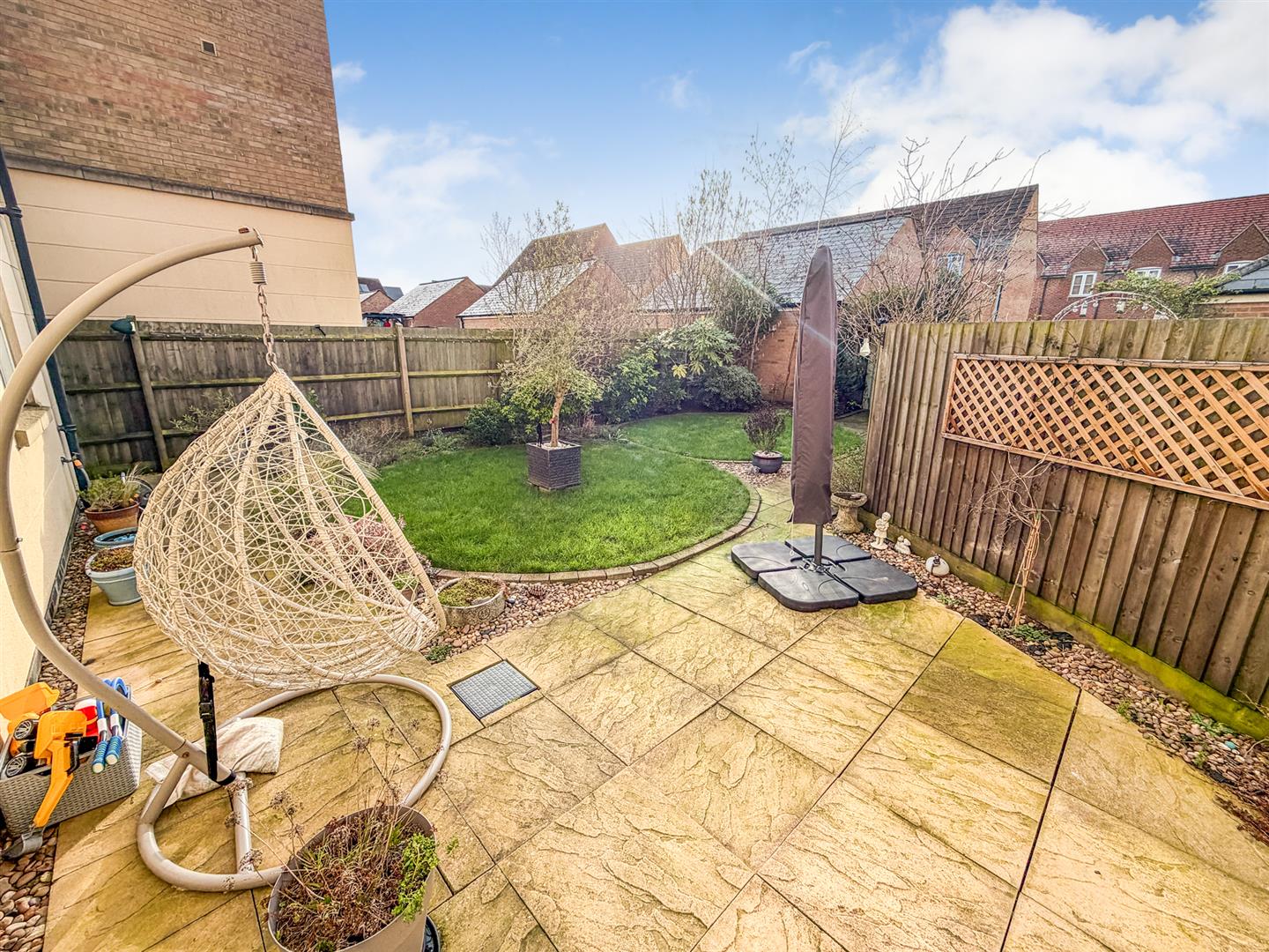 To the rear is a patio which leads to a landscaped laid lawn and block paving, with mature shrubbery and plants, enclosed by brick walling and timber fencing with rear gated access.