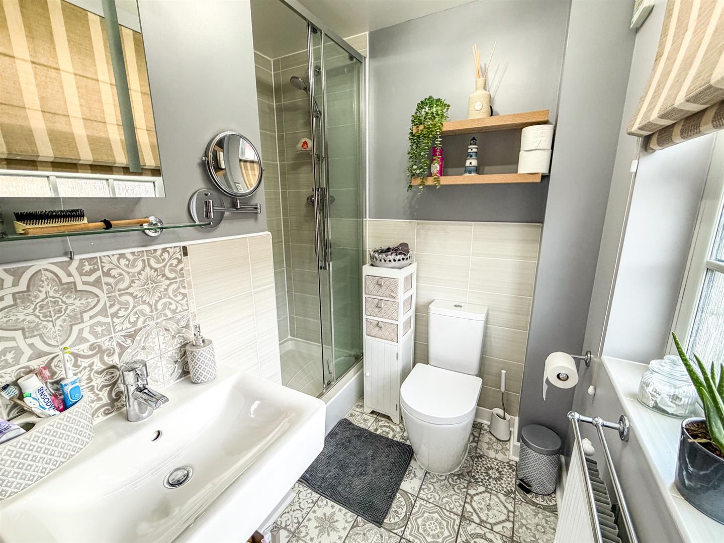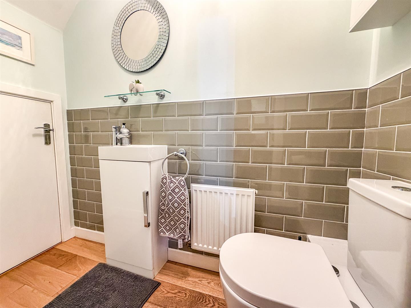 Featuring a three piece suite with a separate shower cubicle, low level pedestal, wash hand basin, double glazed window to the front elevation, extractor fan, chrome towel radiator.