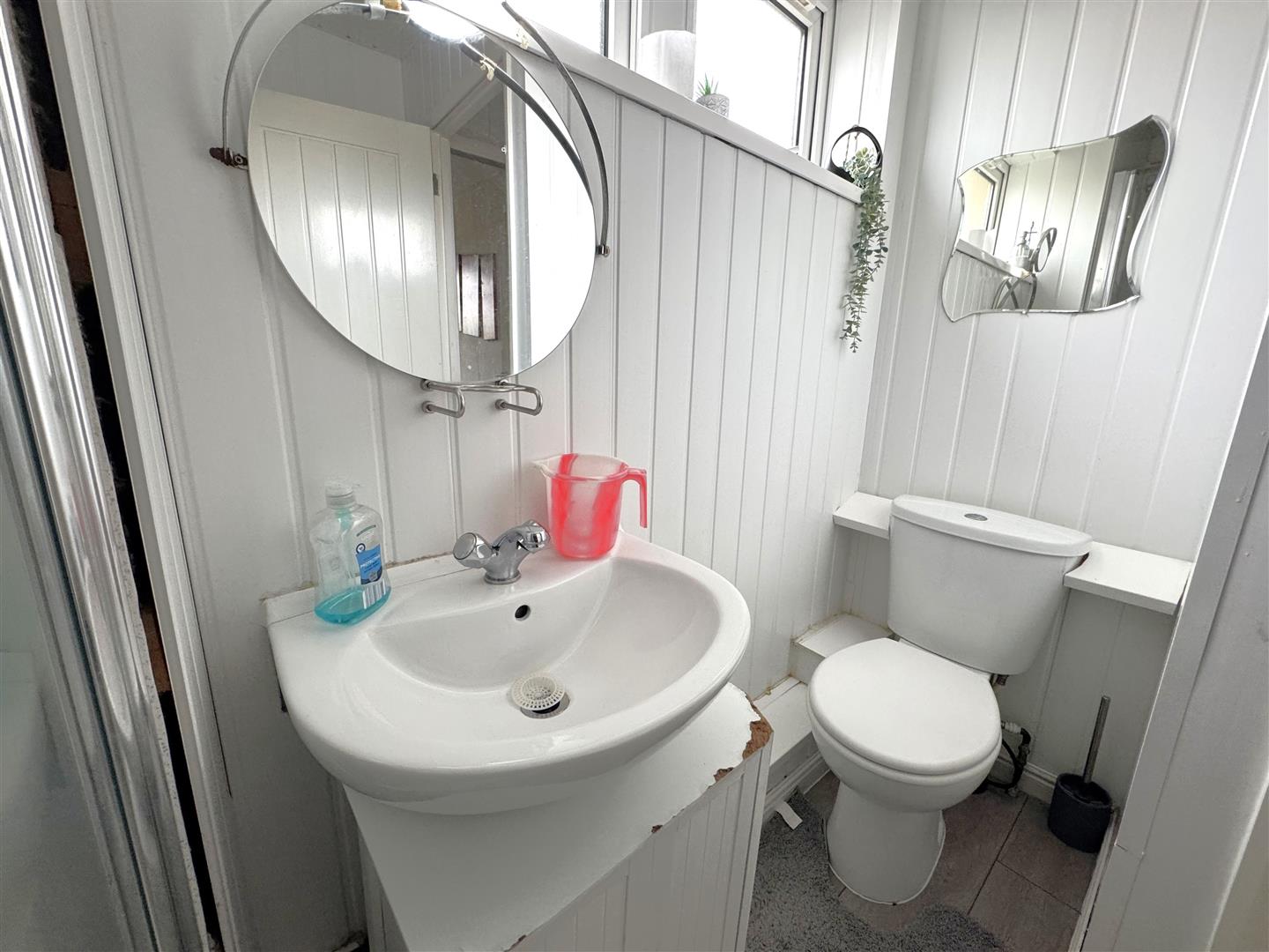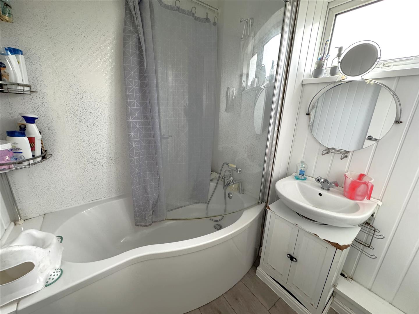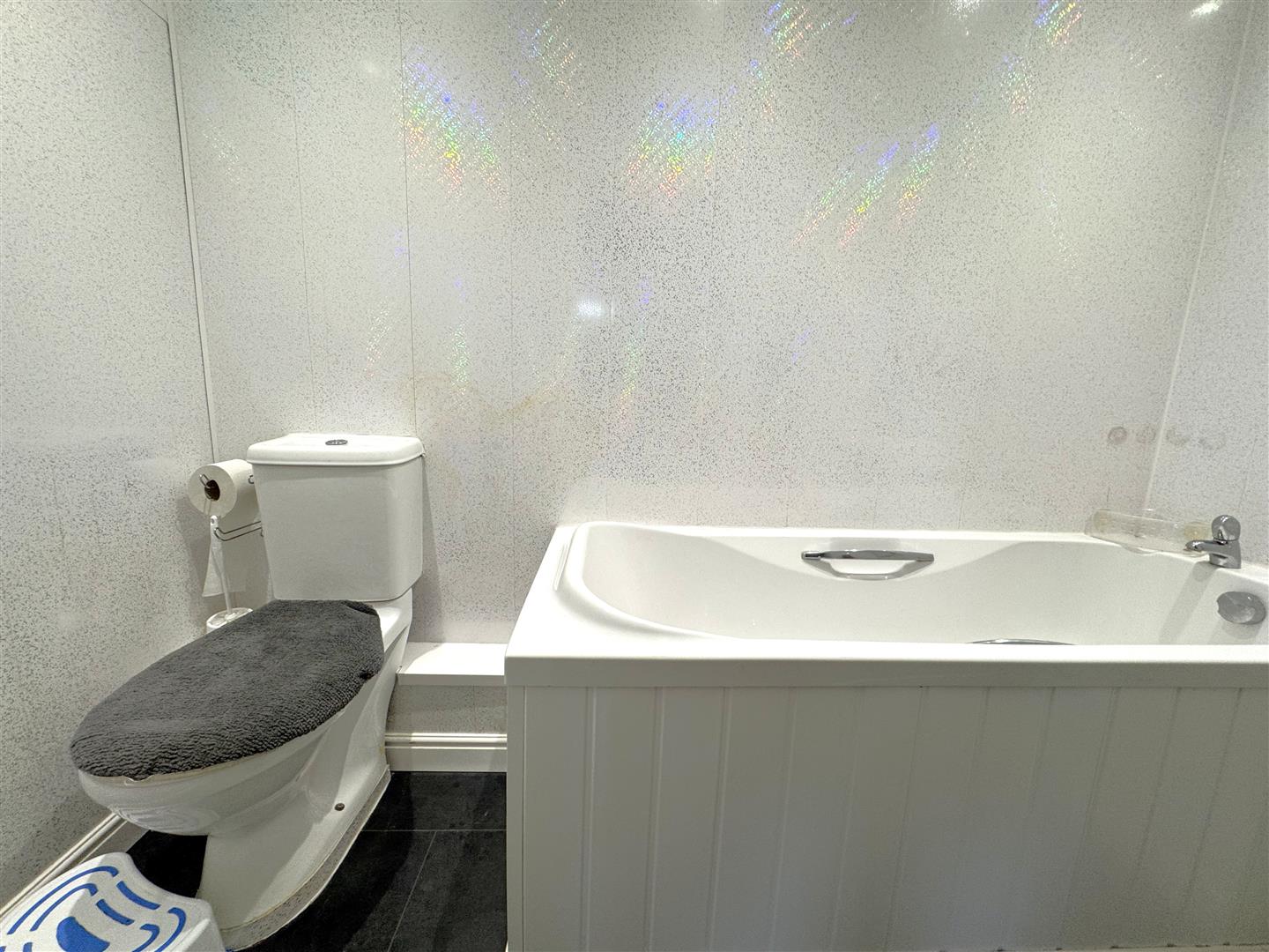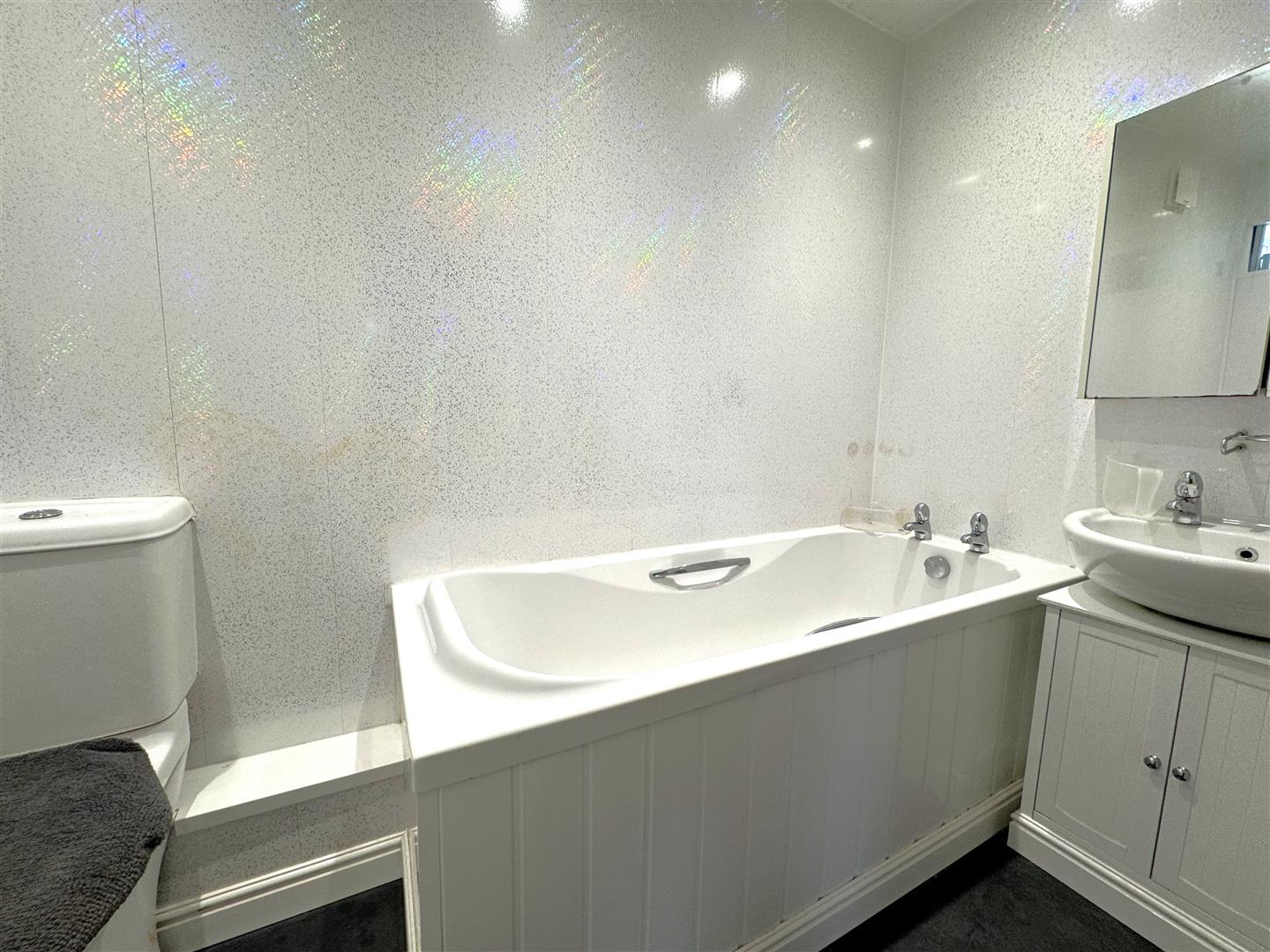 Fitted to comprise of a low level pedestal, low level hand wash basin, panel bath,radiator, spotlights, double glazed window to rear elevation.