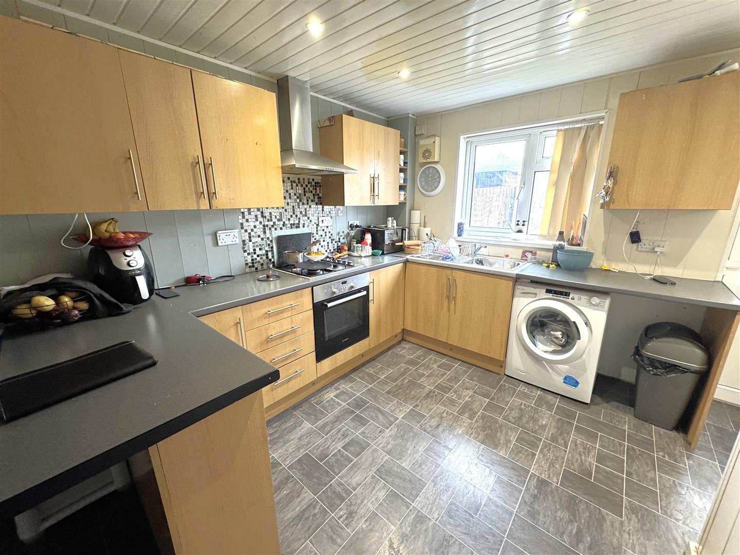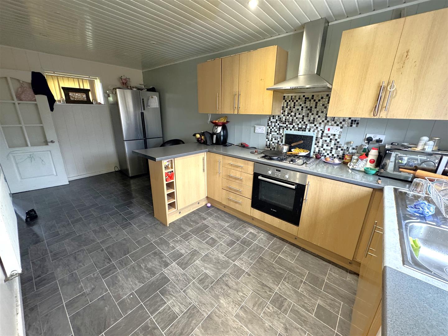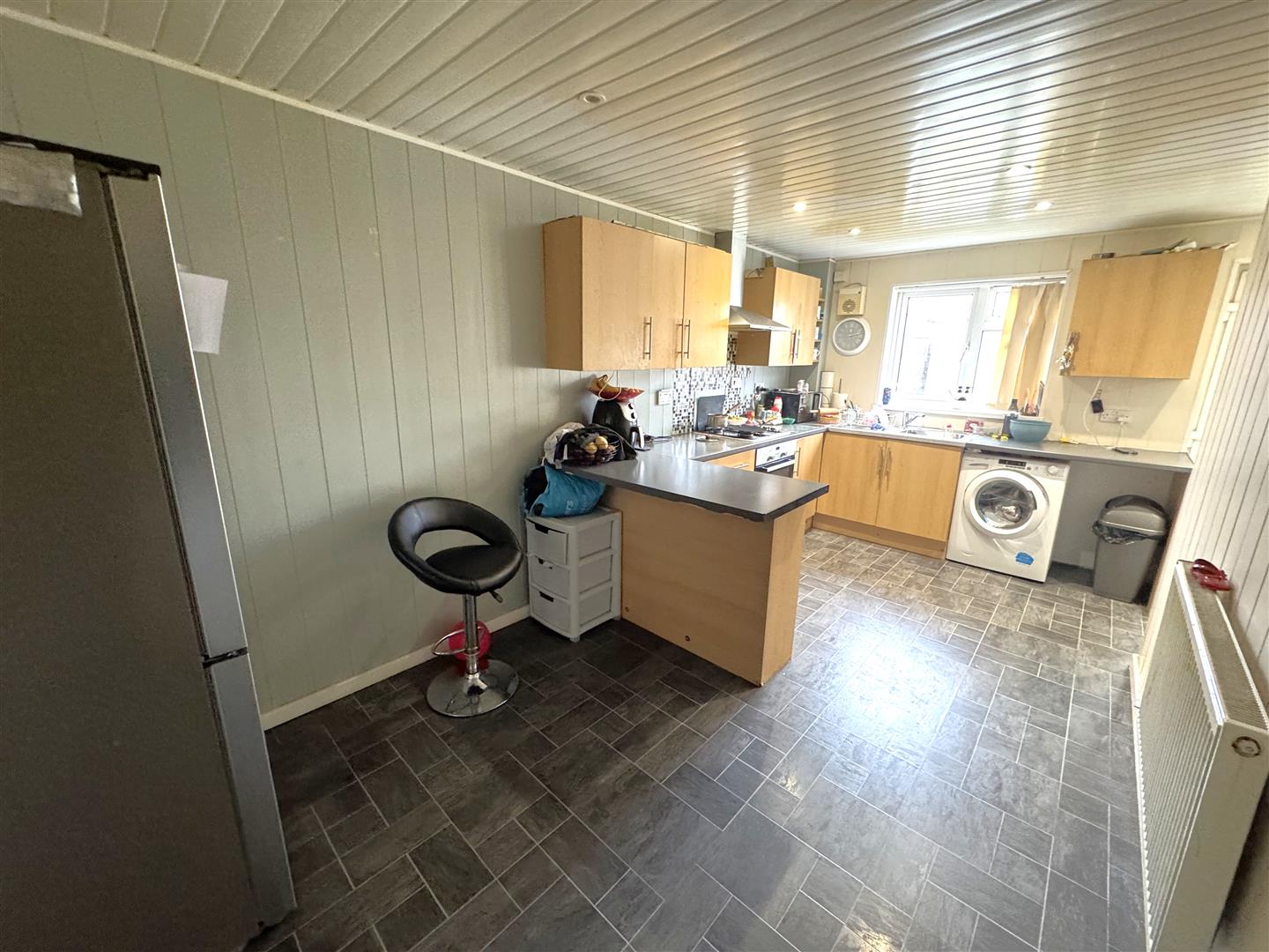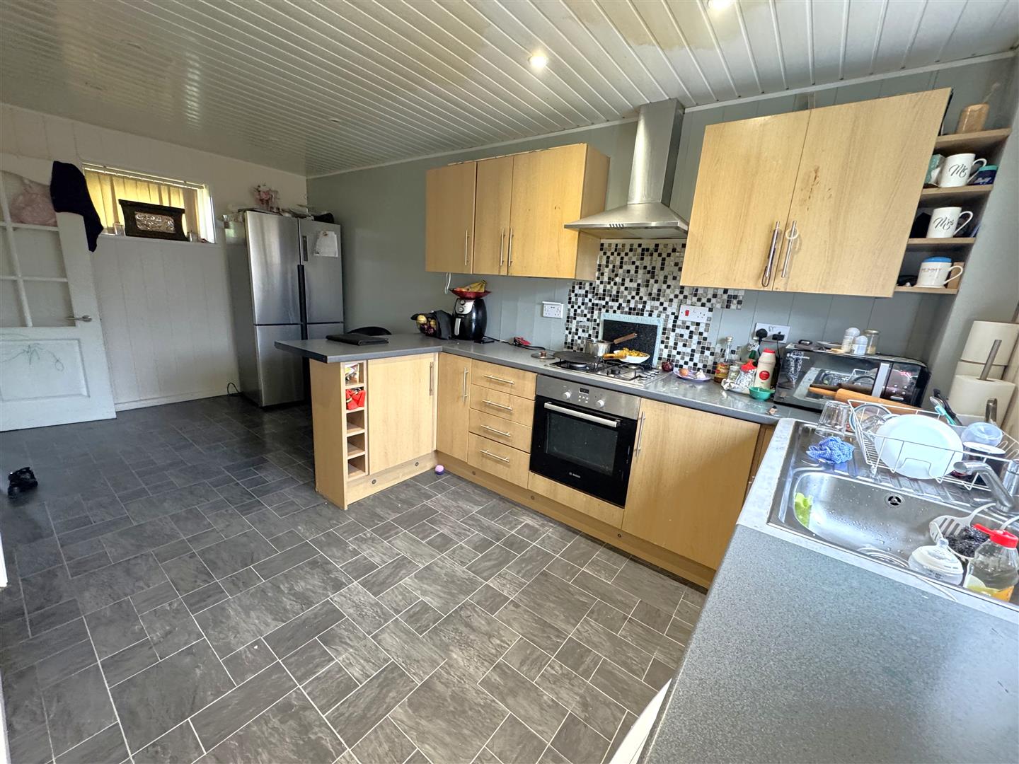 Fitted to comprise a range of base and eye level units, Integrated electric oven, gas hob with overhead extractor, one and a half bowl steel sink and drainer, space for dishwasher, space for automatic washing machine, space for american fridge/freezer spotlights, storage cupboard, radiator, double glazed window to rear elevation, double glazed door to rear elevation.