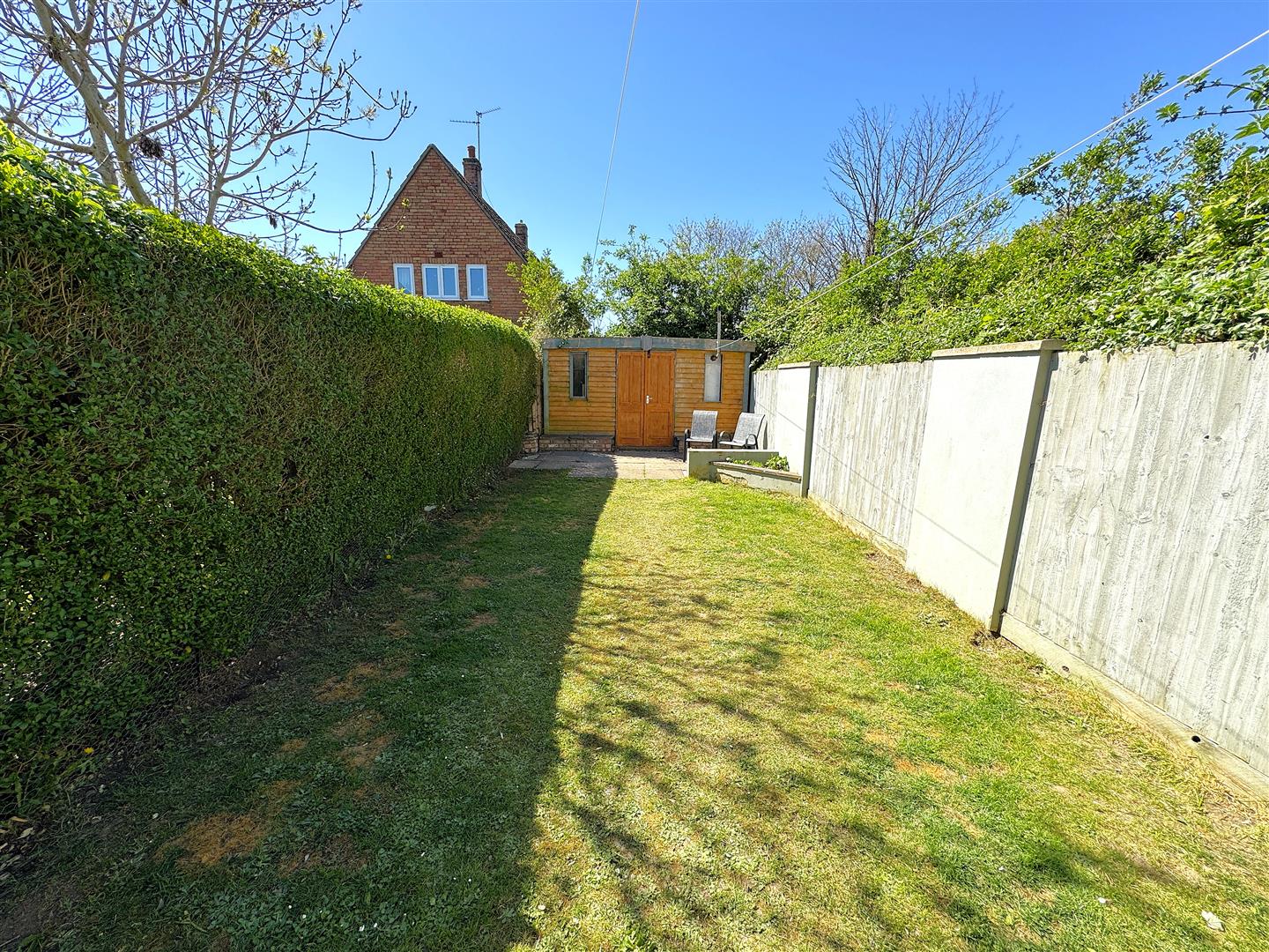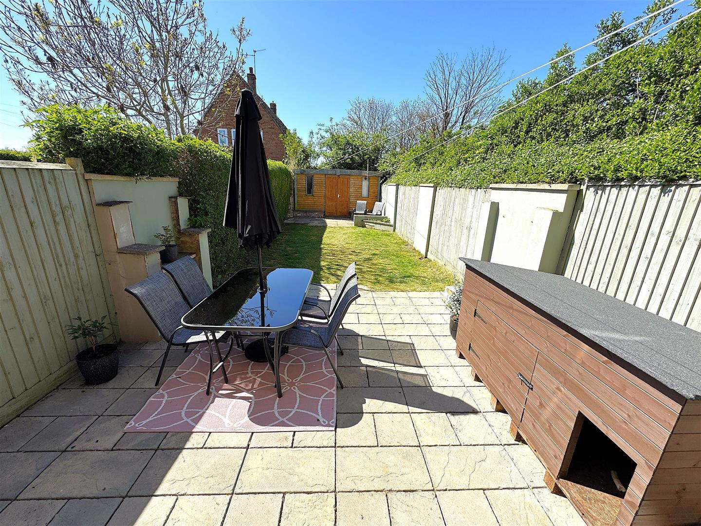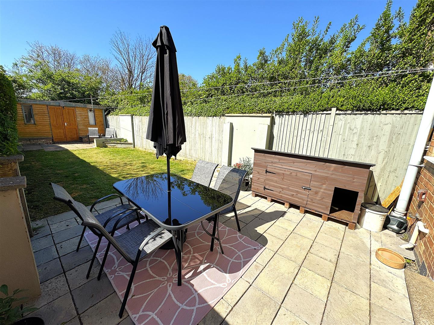 Rear: A patio area leads onto a laid lawn and leading up to a summer house fitted with electrics, timber fencing and large private bush to the sides, gated access over neighbours garden.