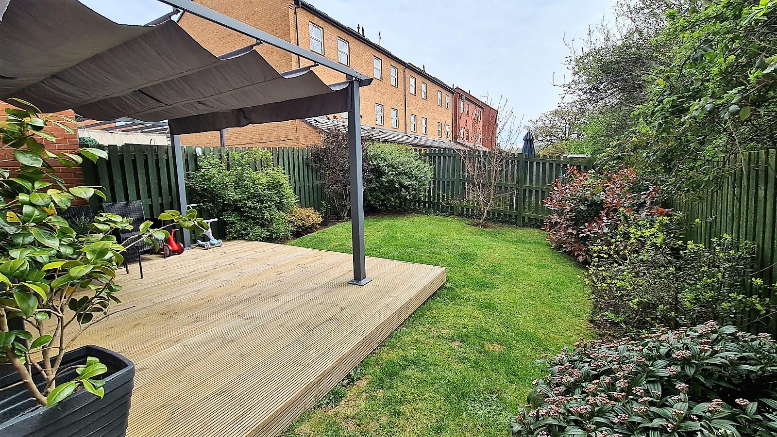 To the rear is a large decking area leading a mostly laid to lawn with a mixture of shrubs boarder all enclosed by timber fence surround.