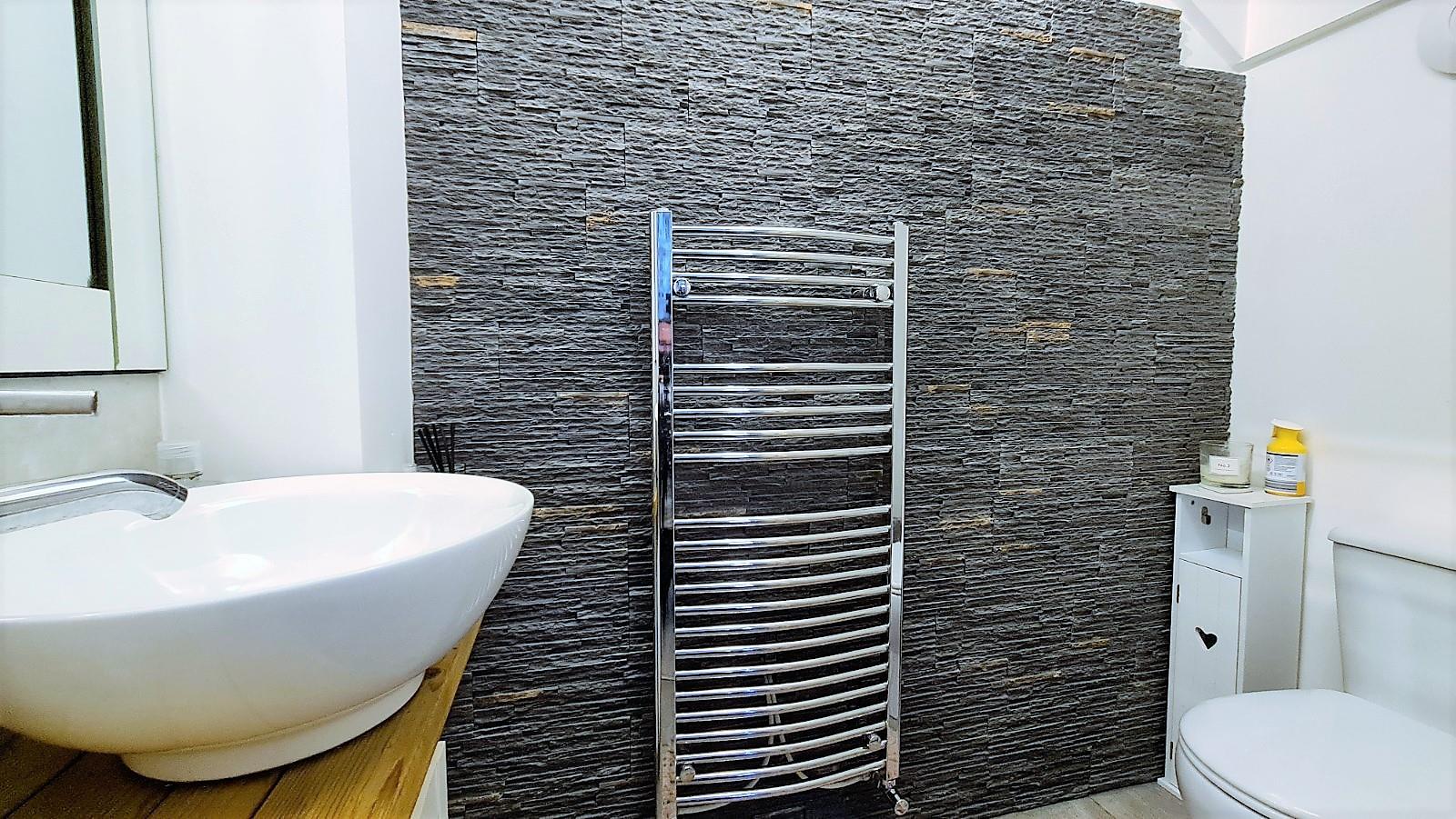 Featuring a two piece white suite with a low level wash hand basin and pedestal, chrome towel radiator, extractor.