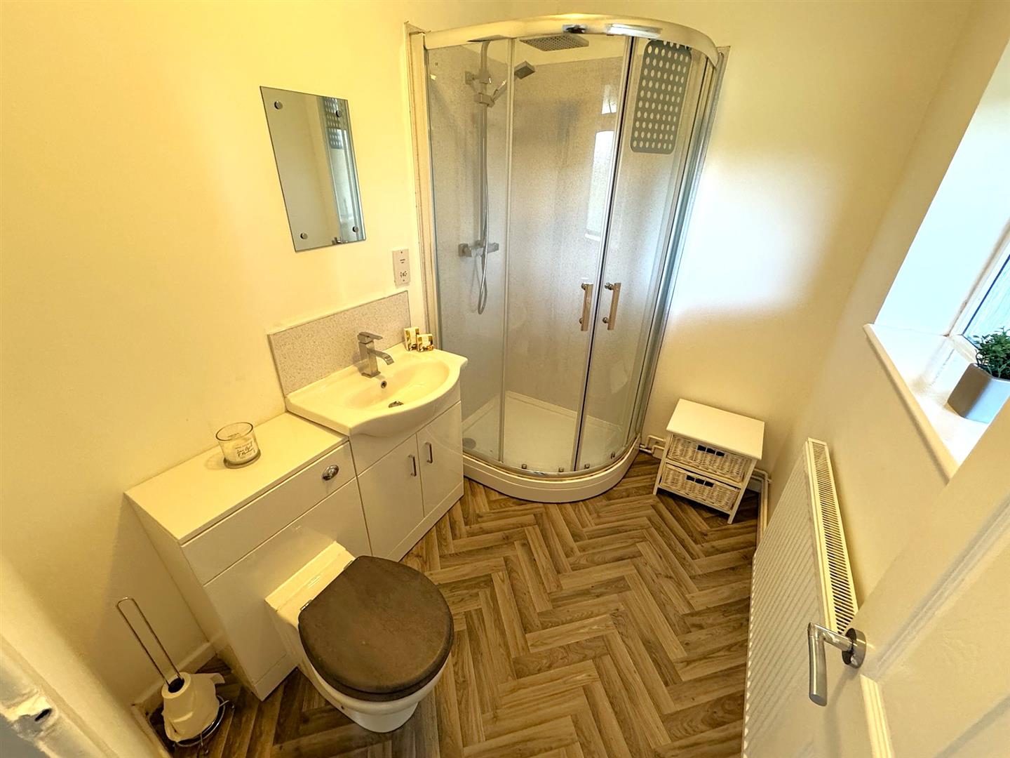 Featuring a three piece suite comprising double shower cubicle, low level wash hand basin, low level pedestal, radiator, double glazed window to front elevation.