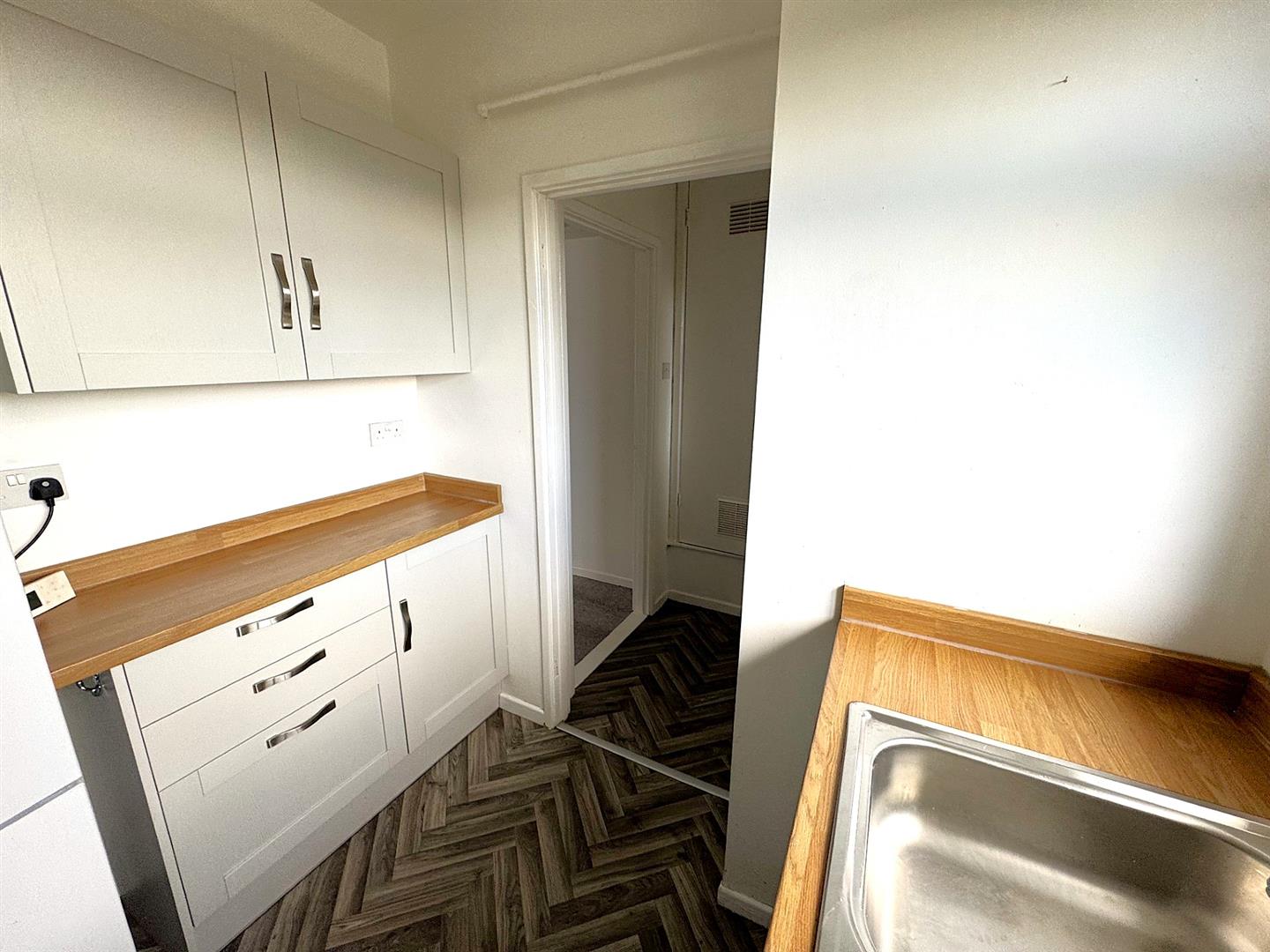 Fitted to comprise a range of base units with a single steel sink and drainer, gas cooker with hob and extractor, electric oven, space for washing machine and freestanding fridge/freezer, radiator, double glazed window to front elevation, wall mounted boiler.