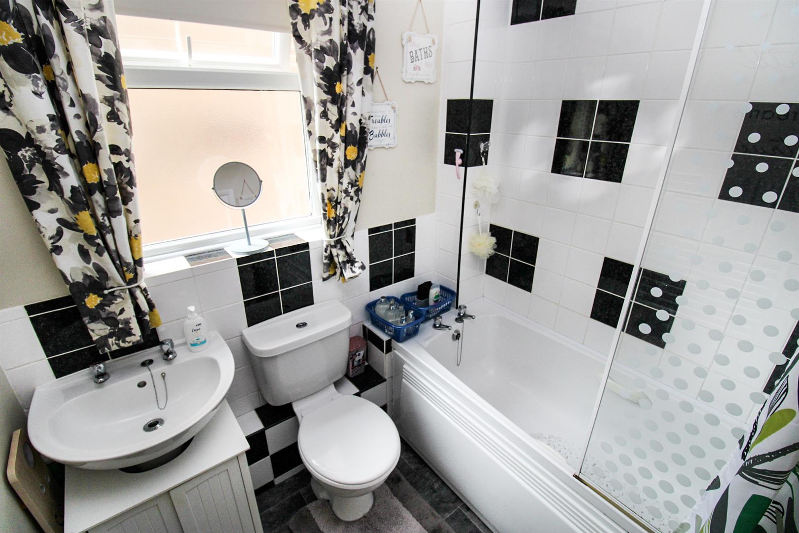 Featuring a three piece white suite with a panel bath and shower over, low level wash hand basin and pedestal, double glazed window to side elevation.