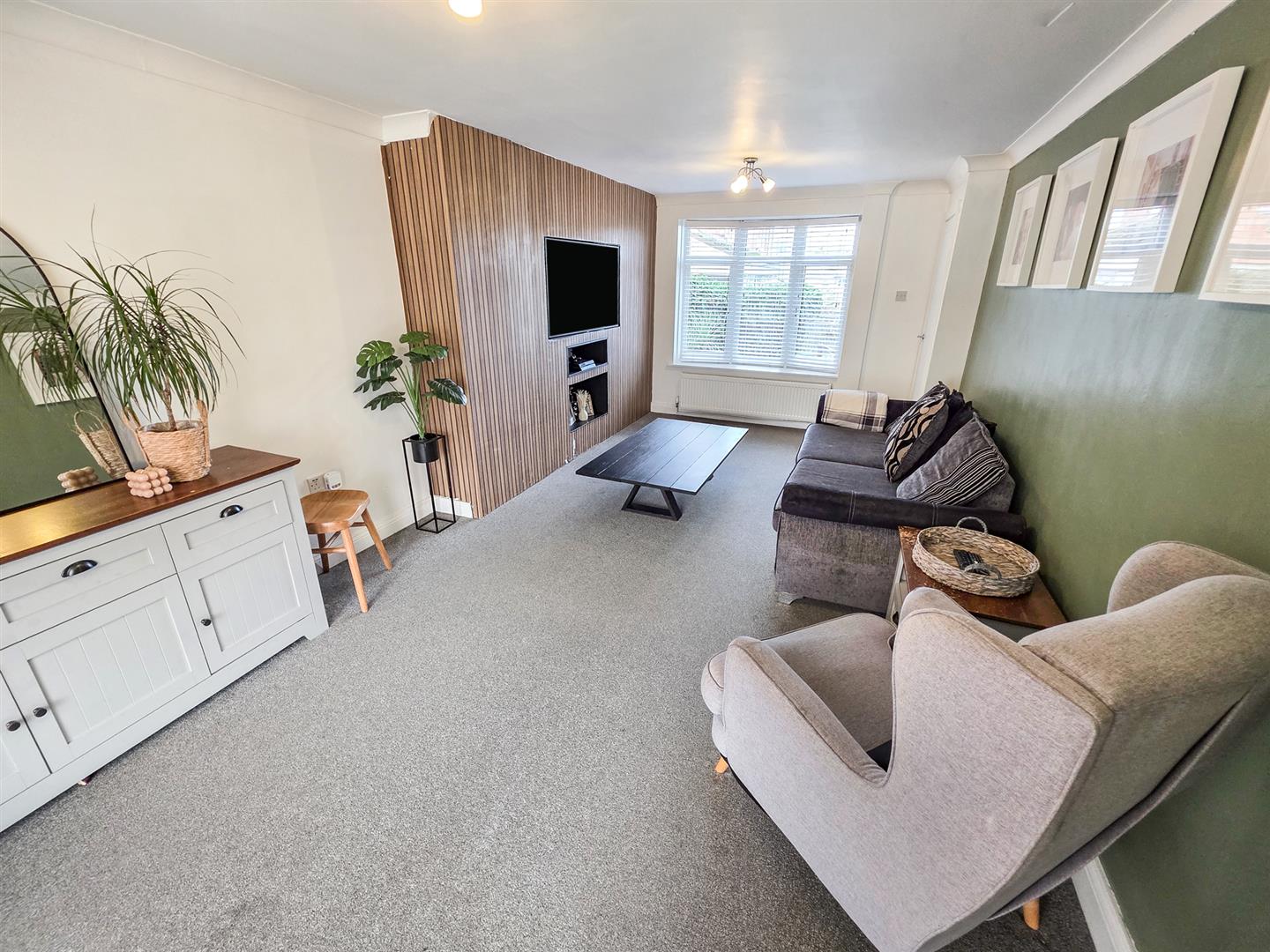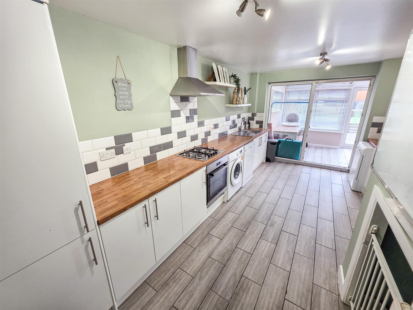 Fitted to comprise a range of base and eye level units with a one and a half bowl sink and drainer, integrated oven, space for fridge freezer, space for washing machine, radiator, double glazed window to rear elevation, under stairs storage, double glazed door to the side elevation.