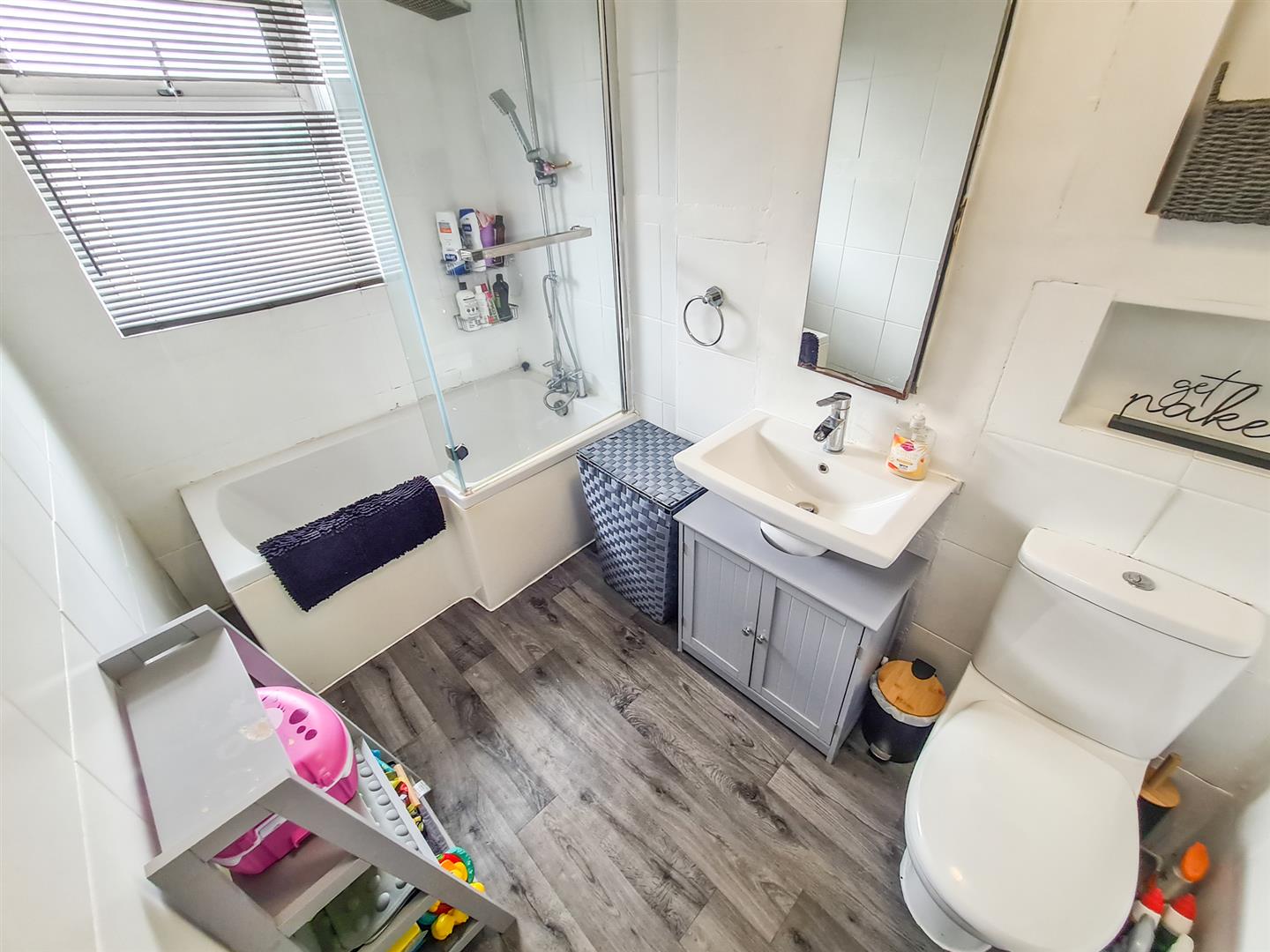 Fitted to comprise a three piece suite with a panel bath and shower over, low level wash hand basin. low level pedestal, radiator, double glazed window to front elevation.