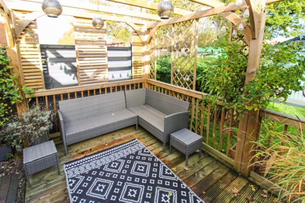 Rear: A large decking area with pagoda leads onto a patio area and large laid lawn, the whole garden is enclose by timber fencing and privet hedges, timber shed, gated access to the front elevation.