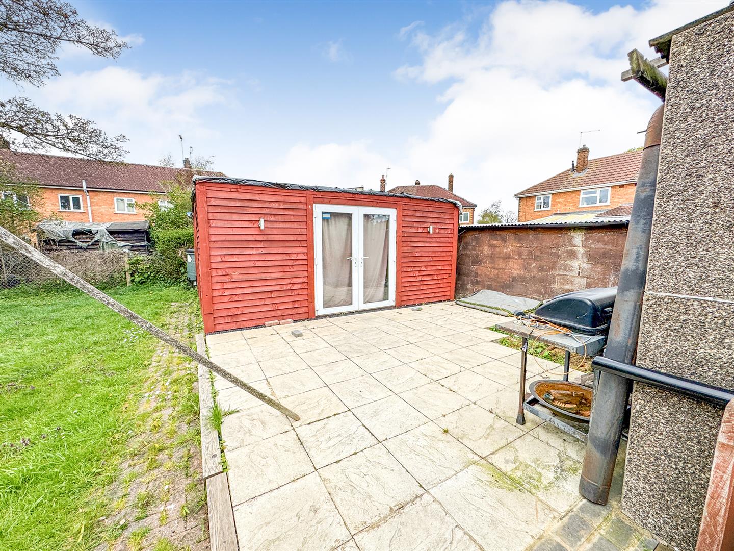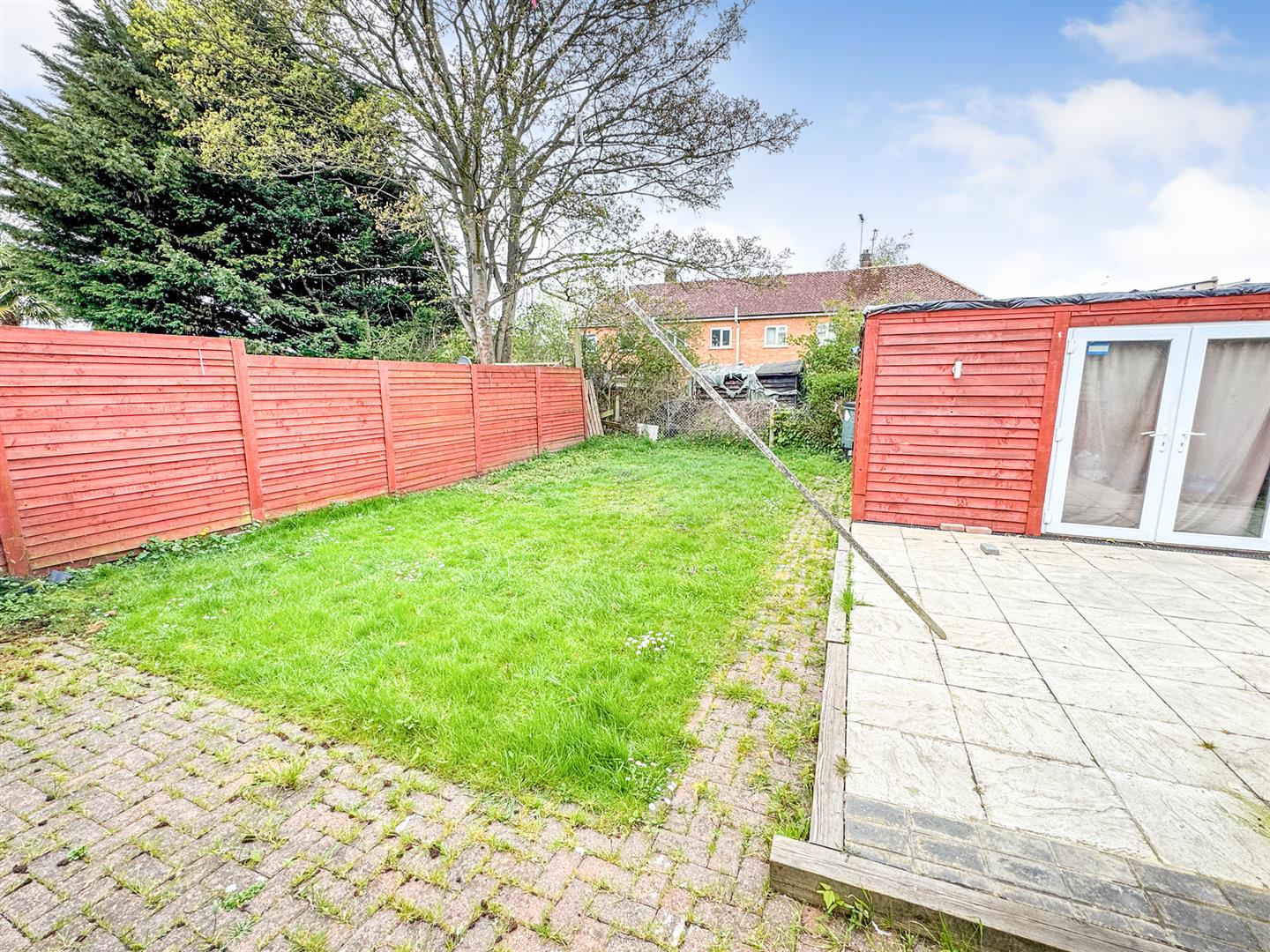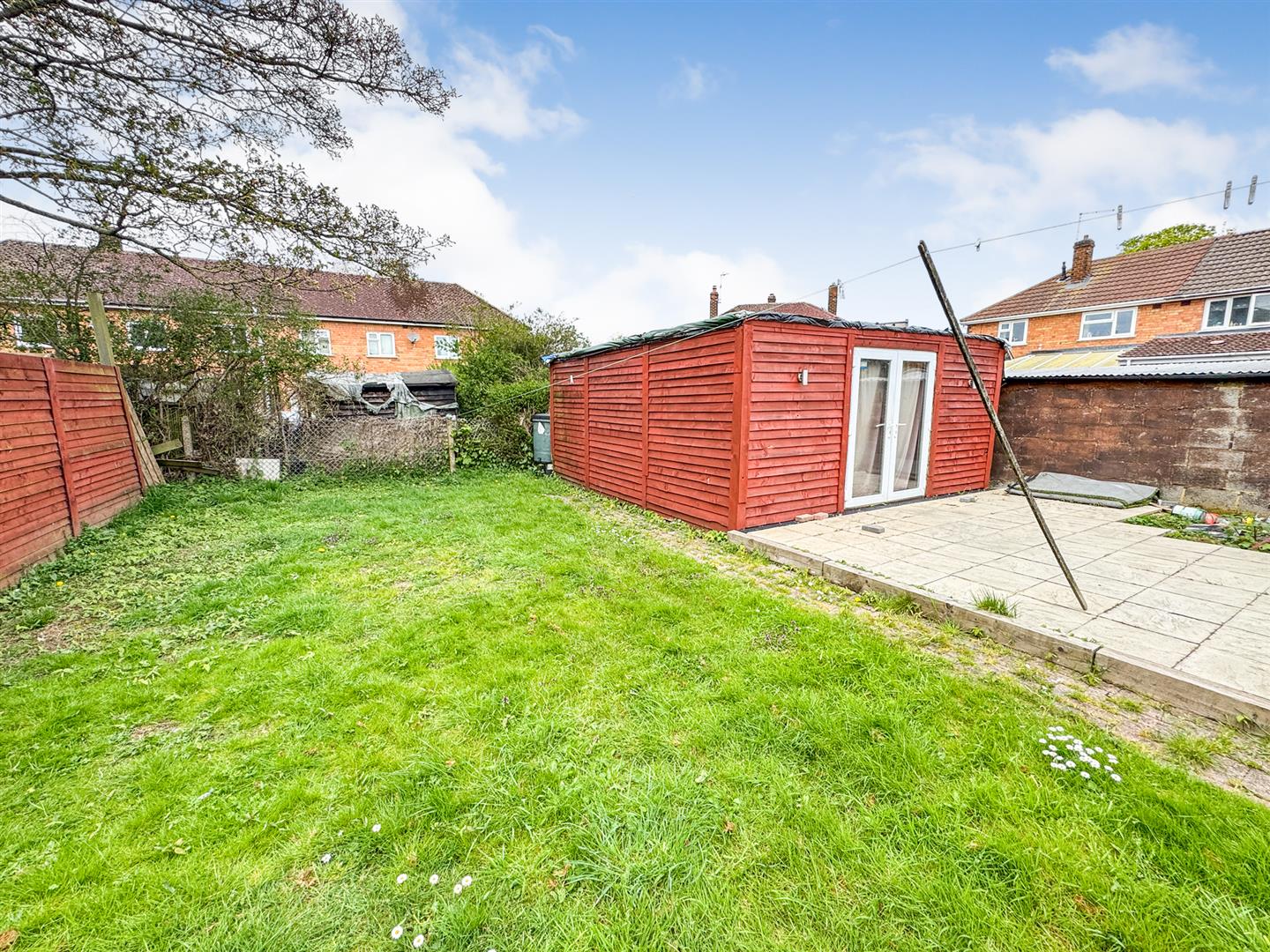 Rear: A patio area leads onto a raised patio area outside the summer house and to a laid lawn, the garden is enclosed by timber fencing to all sides.