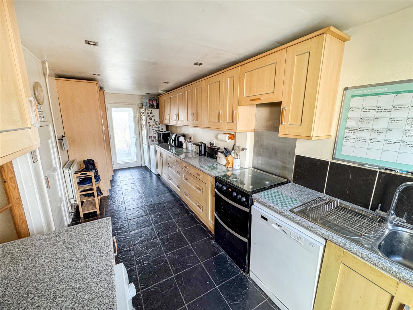 Fitted to comprise a range of base and eye level units with a single sink and drainer, space for free standing gas/electric cooker, space for automatic washing machine, space for condensing dryer, space for free standing fridge/freezer, under stairs storage, double glazed door to porch, double glazed window and door to rear elevation.