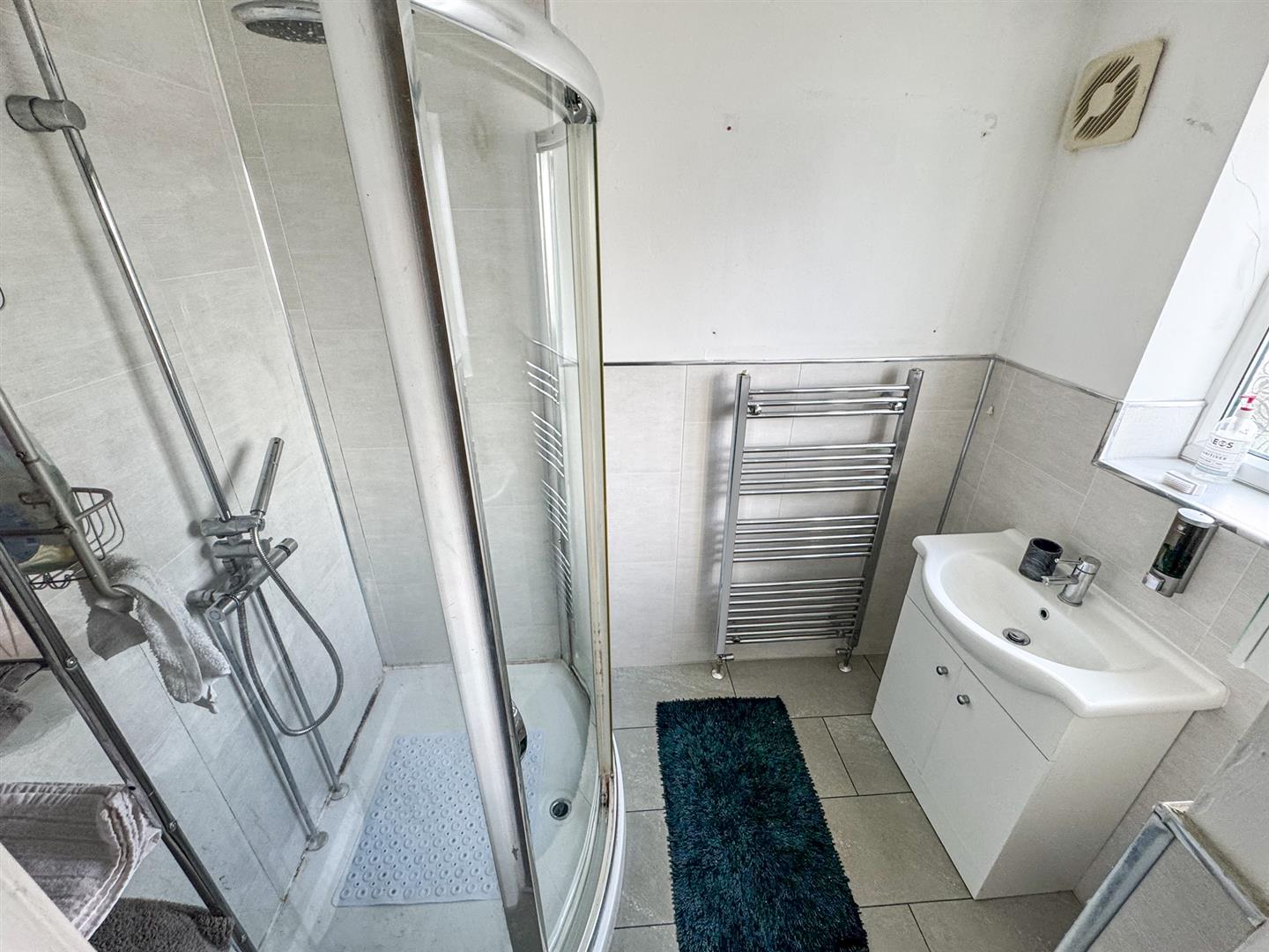 Fitted to comprise a two piece suite consisting of a double shower cubicle, low level wash hand basin, radiator, double glazed window to elevation.