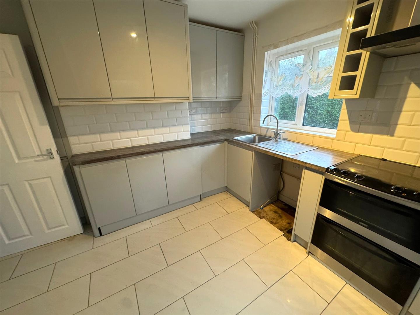 Fitted to comprise a range of base and eye level units with single bowl sink and drainer, gas hob and electric oven, plumbing for automatic washing machine, space for free standing fridge freezer, radiator, double glazed window to rear, under stairs storage, double glazed door to side.