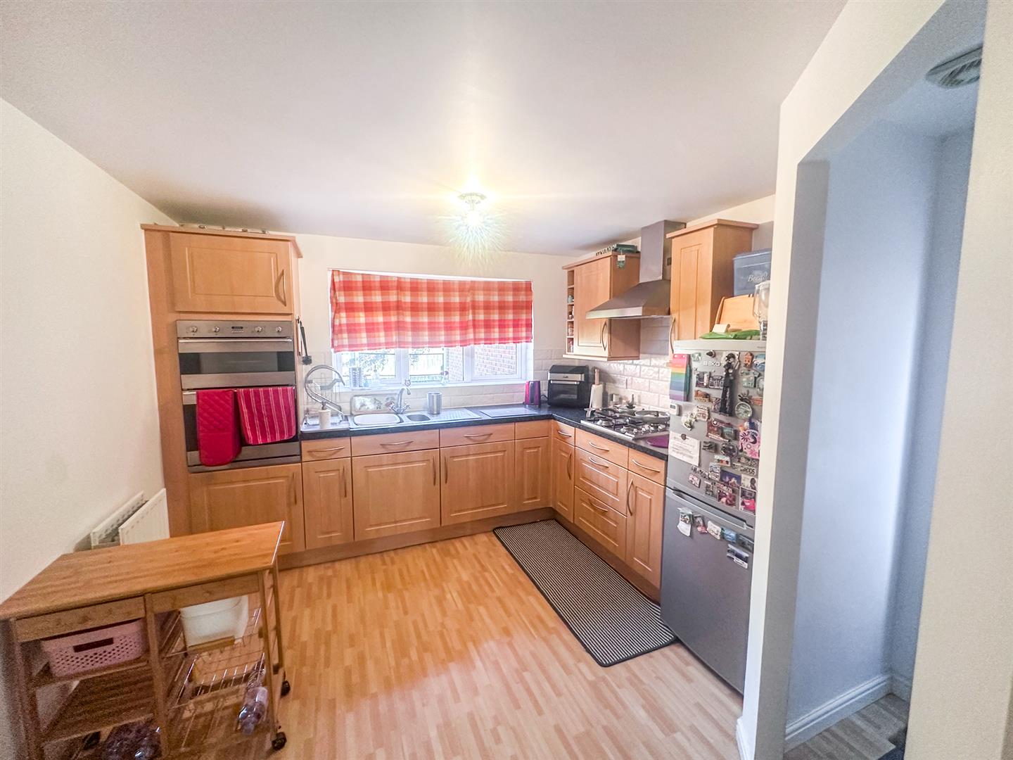 Fully fitted modern kitchen with a range of matching wall and base units with complimentary work surfaces over and splash back tiling, inset stainless steel one and a half bowl sink drainer, integrated double electric oven with gas hob and cooker hood over, space for fridge freezer, radiator, smooth ceiling